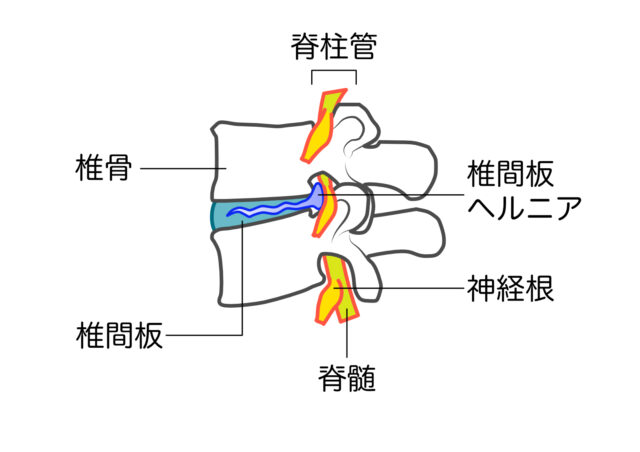 腰のクッション(椎間板)が飛び出して神経を圧迫。比較的若い世代に多いです。
