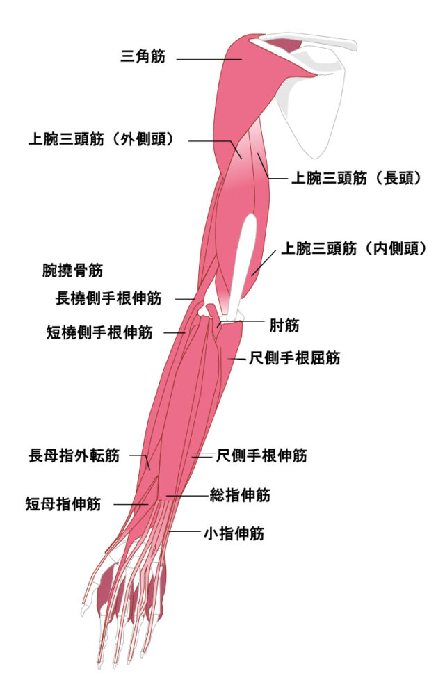 主に前腕伸筋群(特に短橈側手根伸筋)が該当します。