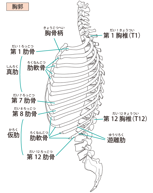 胸郭は、12本の胸椎・12対の肋骨・胸骨で構成され、まるで「鳥かご」のように体幹を包んでいます。